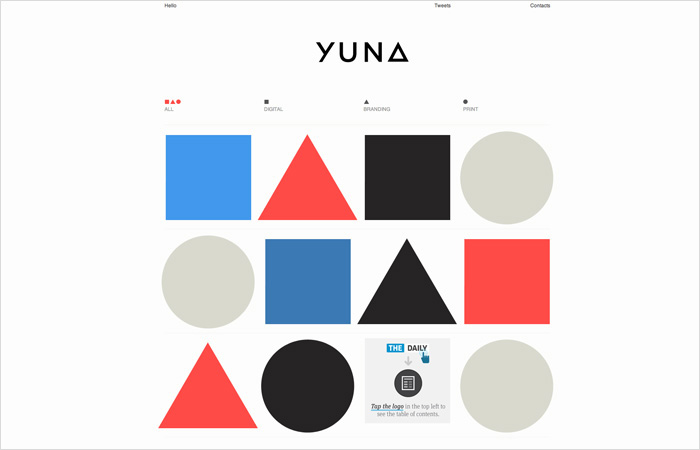 圖形化為中心的個(gè)人網(wǎng)站,由于信息不多,大膽的采用了大面積留白設(shè)計(jì),巧妙之處在于在留白的基礎(chǔ)上以圖形作為網(wǎng)站的主要特色和主旨,通透活潑而不失嚴(yán)謹(jǐn)。